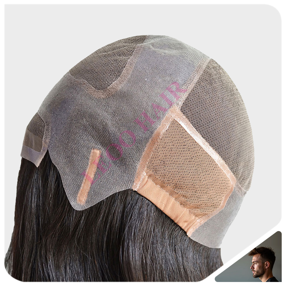BASE: Custom men's front and top Swiss lace + PU + side elastic net wig. Breathable and invisible lace. The elastic net is easy to adjust and wear.